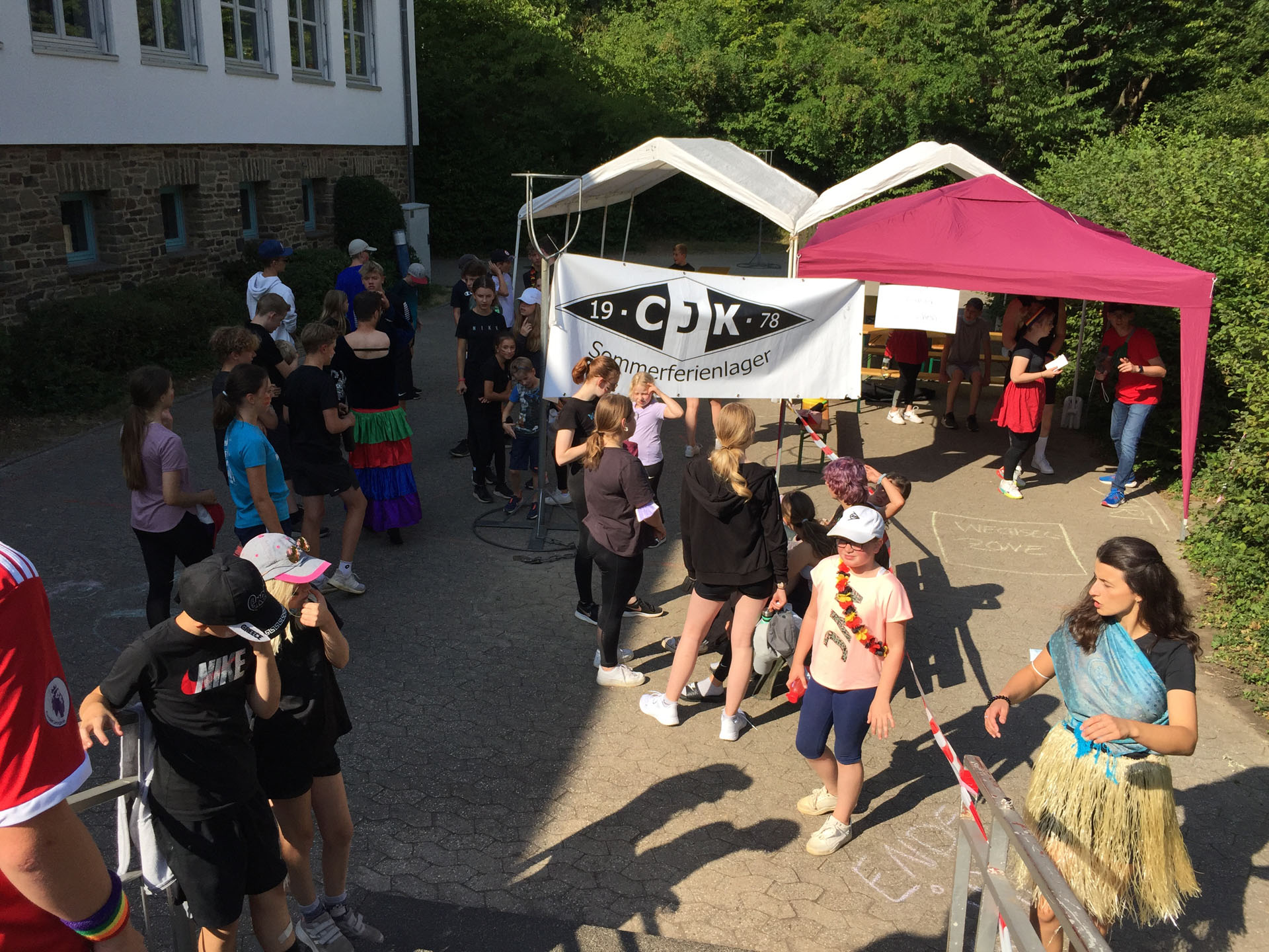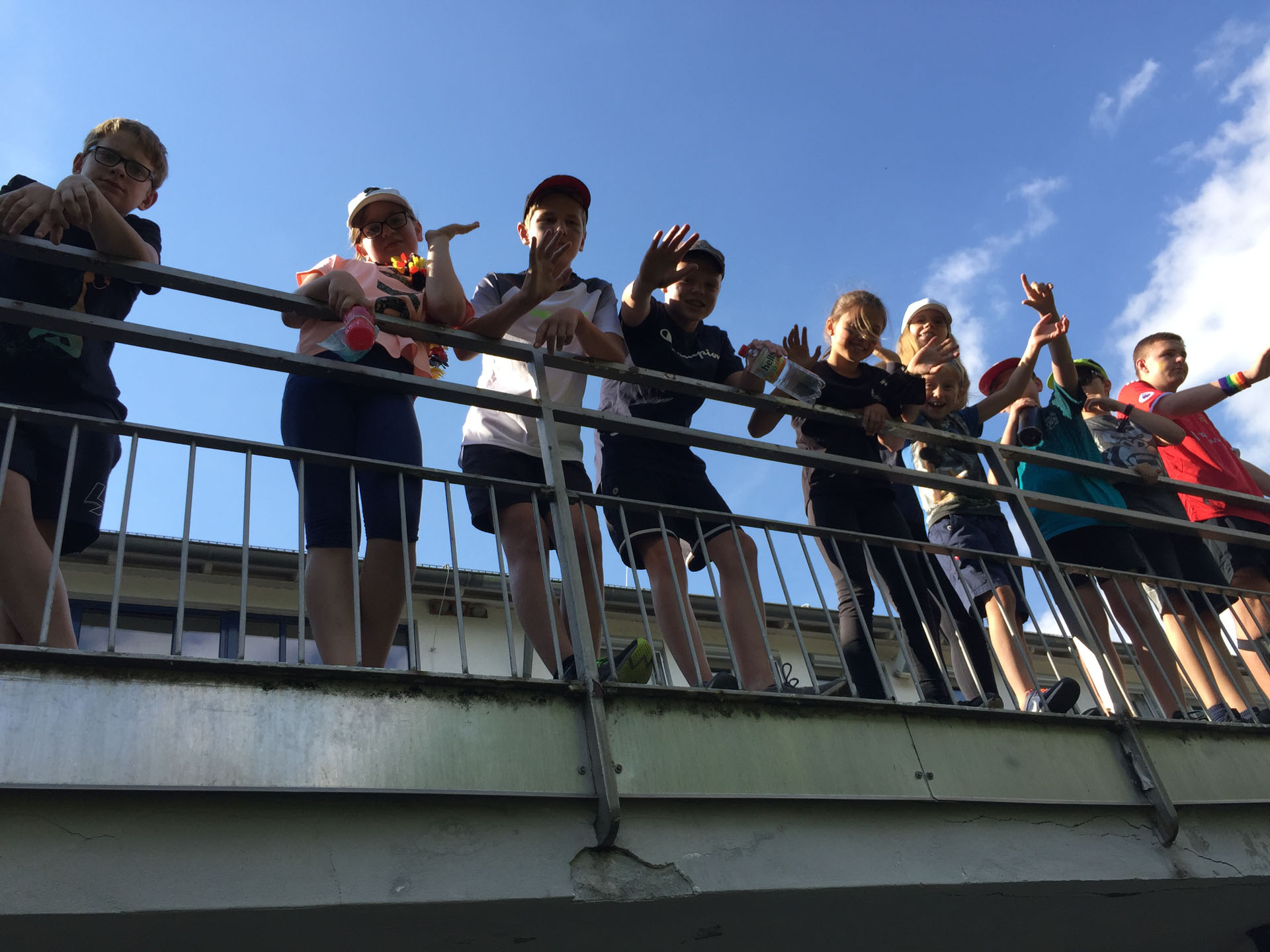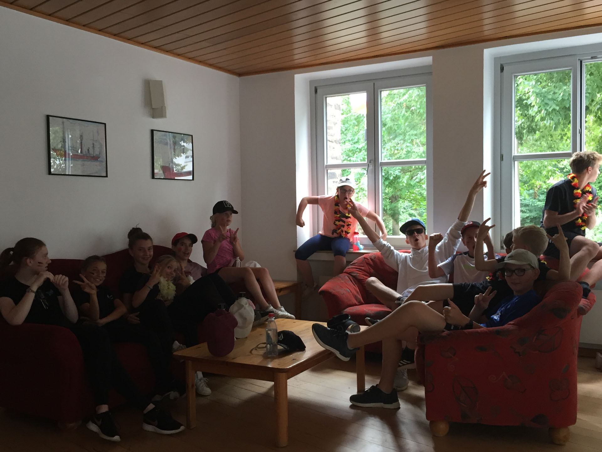 Nach dem Mittagessen stand dann die Show „Catch!“ an. Die Kinder wurden in Gruppen eingeteilt und sind in verschiedenen Fangspielen, wie beispielsweise Minutenfangen, Linienfangen oder Wäscheklammerfangen gegeneinander angetreten. Wie in der Originalshow auch wurde jeder Gruppe ein Prominenter oder eine Prominente an die Seite gestellt. Zu Besuch waren heute Stars und Sternchen wie Vaiana, Carmen Geis, Fabian Hambüchen oder Heidi und Leni Klum. Nach einem spannenden Halbfinale machten sich die beiden letzten Gruppen zum legendären Parcours auf. Über das gesamte Gelände der Jugendherberge war dieser verteilt worden. Die Gruppen mussten die Hindernisse überwinden und sich gleichzeitig gegenseitig fangen. Nebenbei konnte mit dem Finden von Betreuer-Buzzern am Streckenrand gepunktet werden. In einem umjubelten Finalrennen konnte die Gruppe 7 dann den Sieg nach Hause bringen.