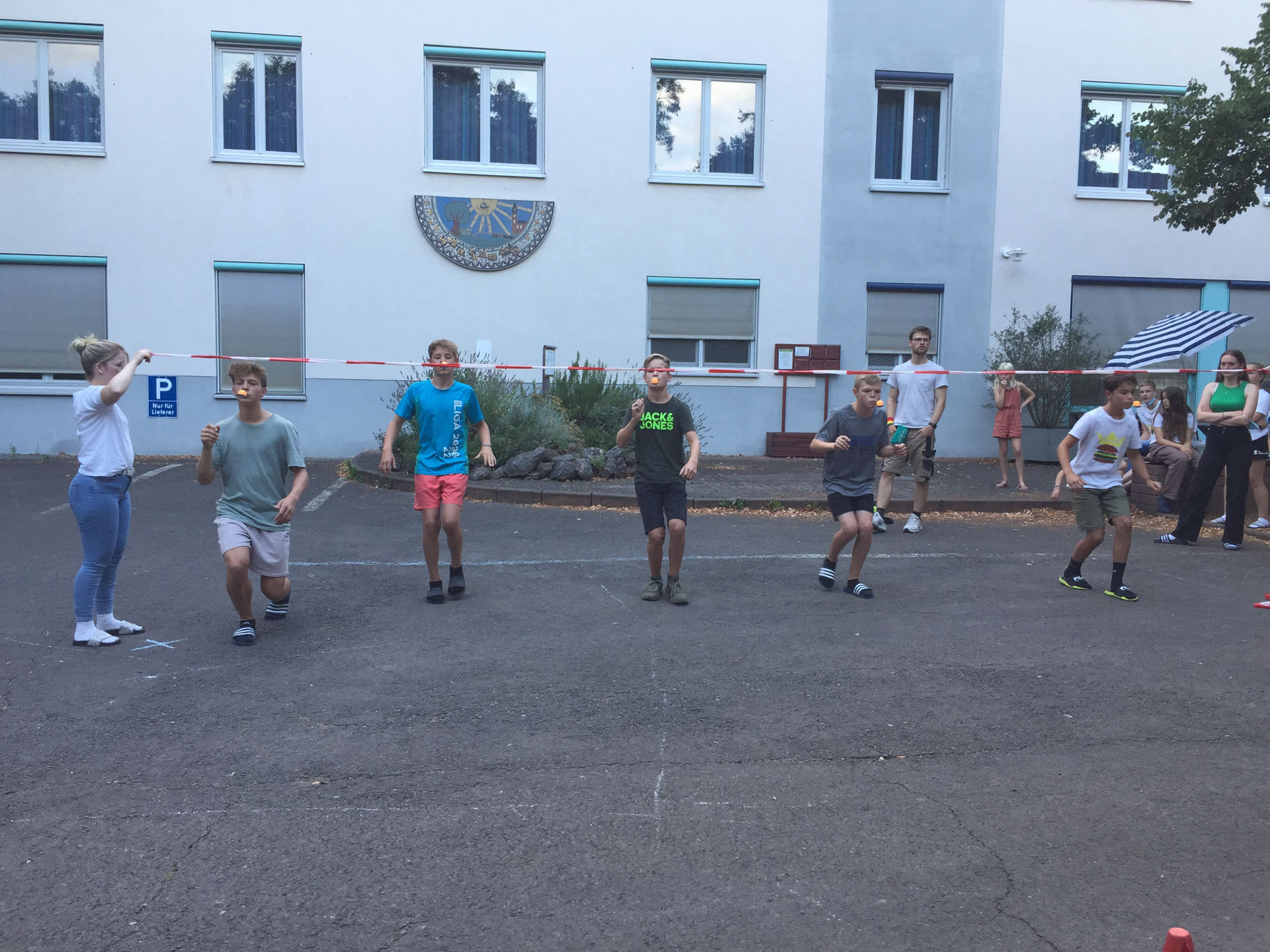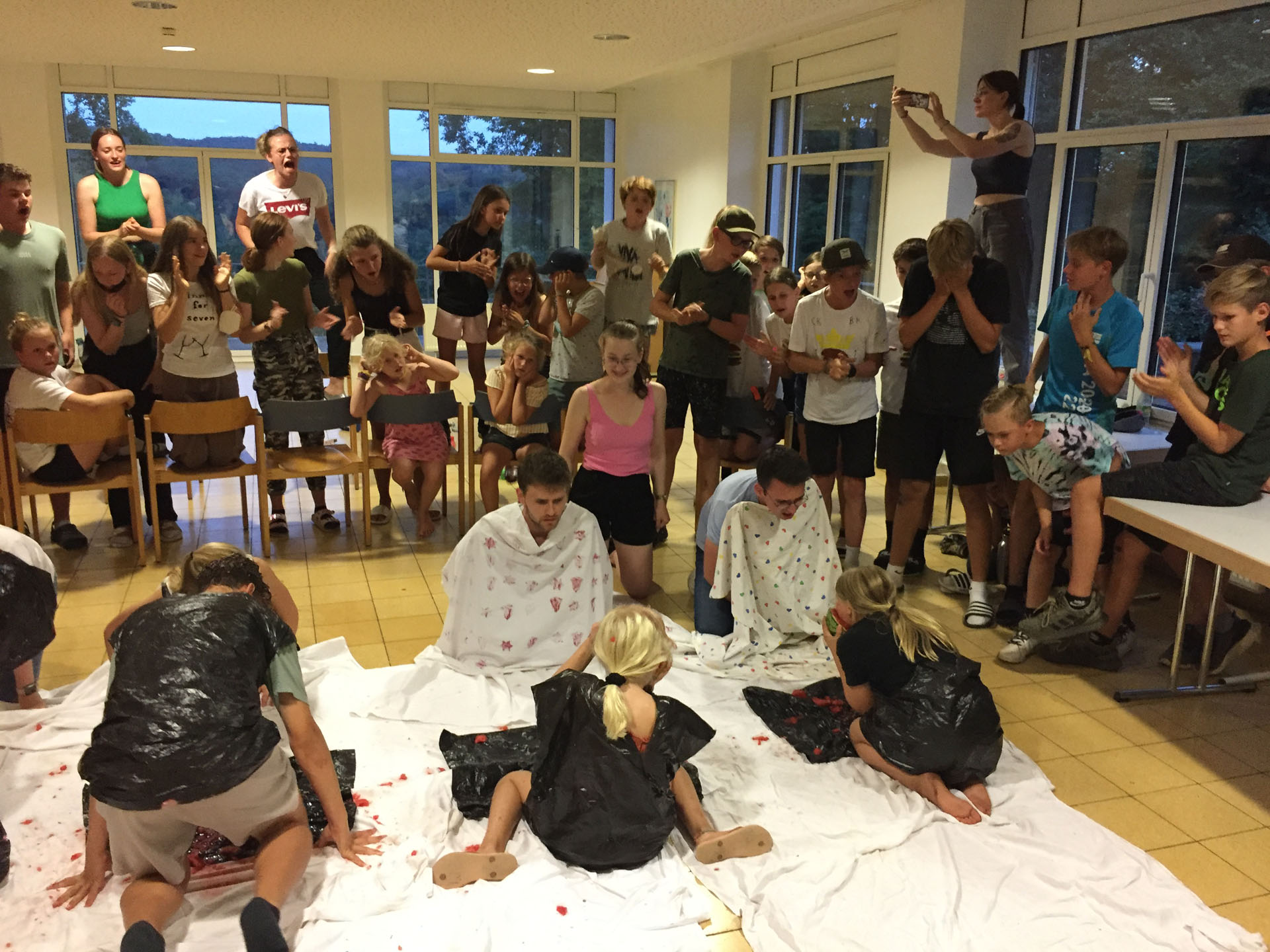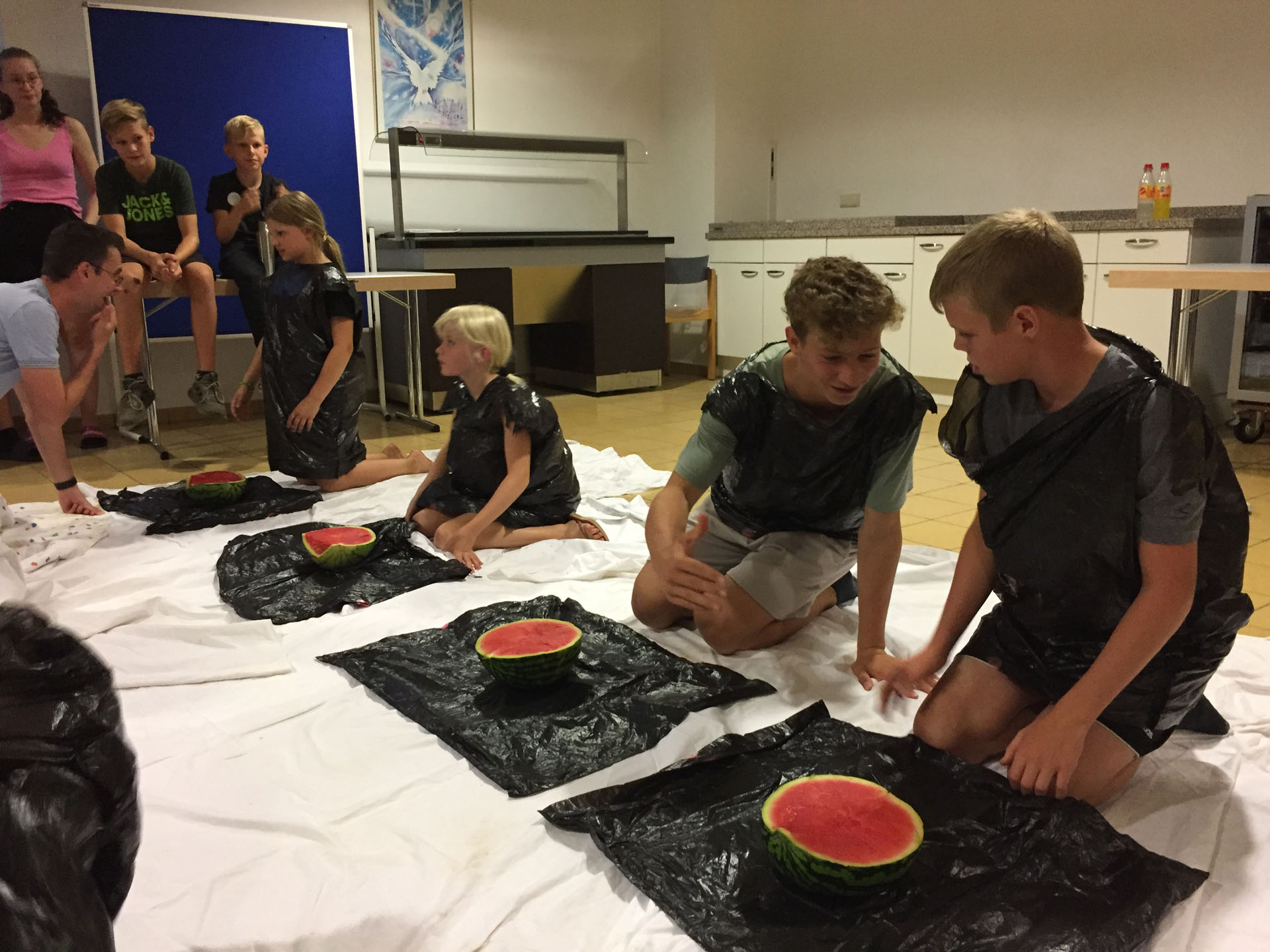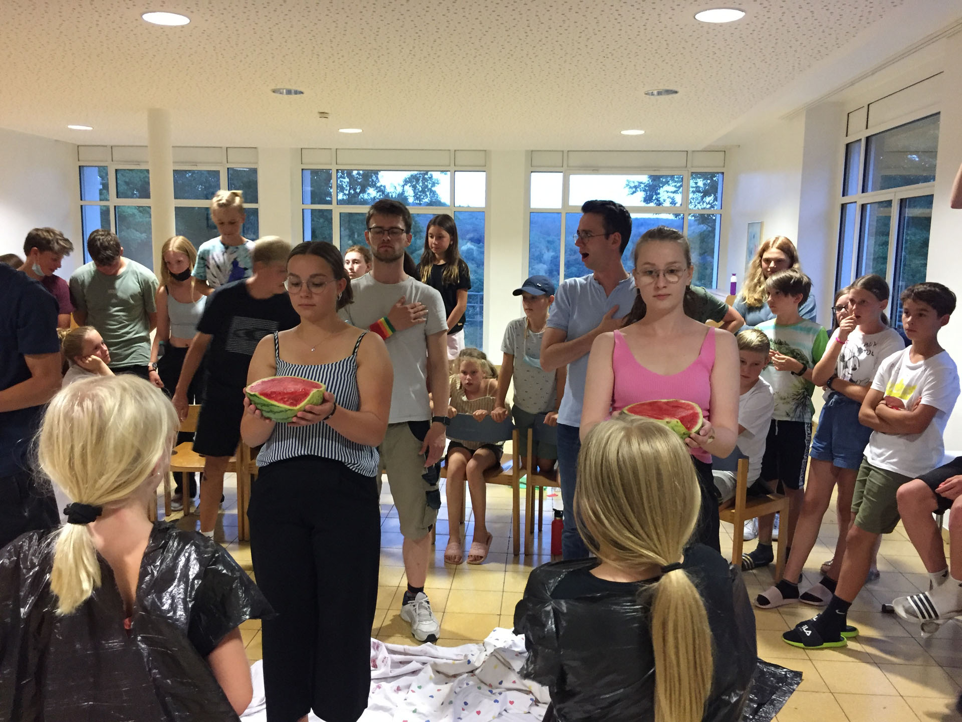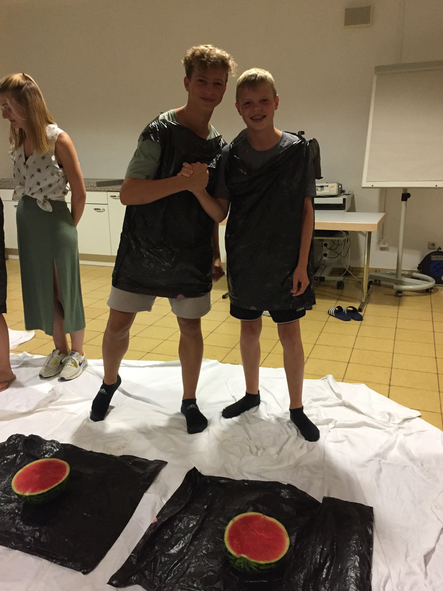 Am Abend war es dann so weit. Einer der beliebtesten und wichtigsten Programmpunkte des CJK-Ferienlagers stand an. Mr. und Mrs. Lager sollte wie jedes Jahr den krönenden Abschluss unserer Reise gestalten. Dazu losten wir bereits zum Abendessen 8 Jungen und 8 Mädchen aus, die um den Titel des Mr und Mrs Lager spielen würden. Nach einigen kniffligen Minispielen kamen wir dann schon zum Finale. Die Stimmung kochte vor Aufregung bereits über, als das legendäre Melonenwettessen angekündigt wurde. Ziel dabei ist es, sich nur mit dem Gesicht durch eine halbe Melone zu kämpfen und dann die eigene Zunge durch ein Loch zu stecken, dass sich am Boden der Melone befindet. Nach einem nervenaufreibenden und spannenden Finale hatten wir dann auch endlich unsere Sieger. Mrs. Lager wurde Hannah aus den jüngsten Mädchen und Mr. Lager wurde Mattis, bereits zum zweiten Mal.