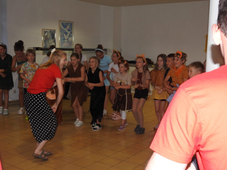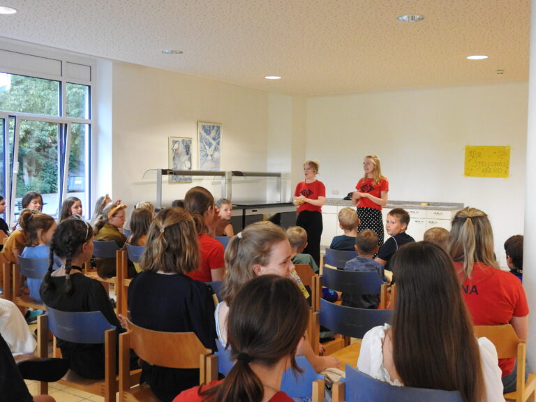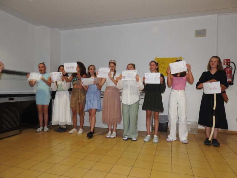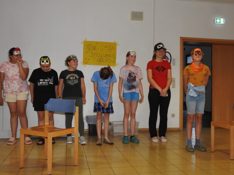Dann war es endlich soweit, der Vorstellungsabend war im vollen Gange. Uns wurden grandiose Auftritte, wie zum Beispiel eine Show vom König der Löwen oder auch der Wilden Kerle geboten. Auch spannende Challenges wurden angegangen. Zum Beispiel mussten die Kinder, den Betreuern ihren Beruf oder ihre Betreuerjahre zuordnen. Nach solch einem spannenden und aufregenden Tag, verabschiedeten wir uns mit dem letzten Lied und nach dem Zähneputzen konnte niemand mehr gegen die Müdigkeit ankämpfen.