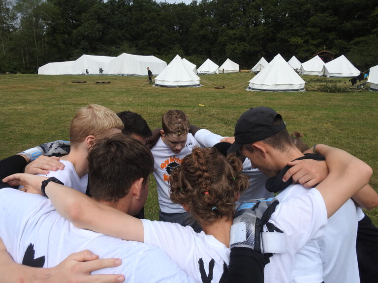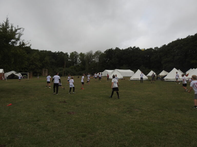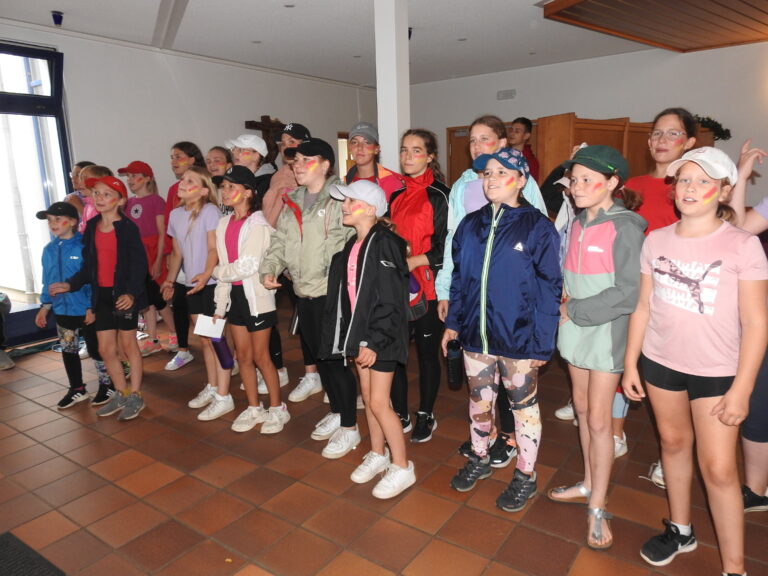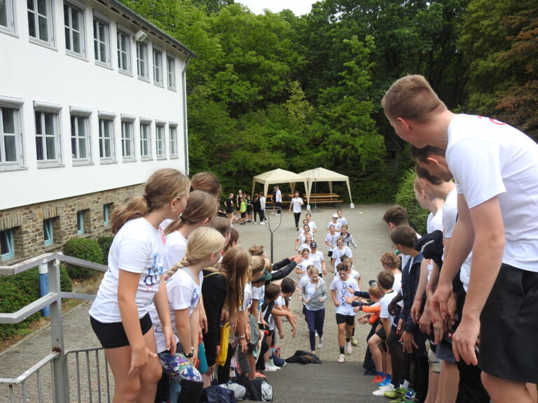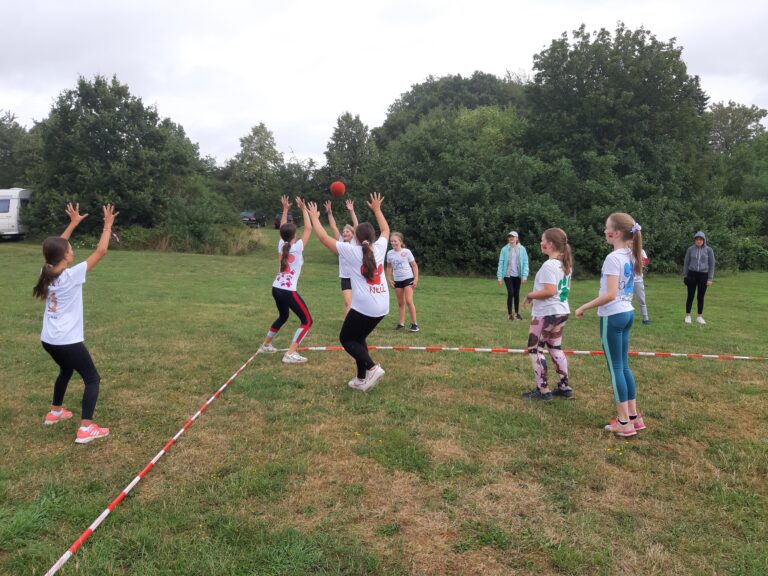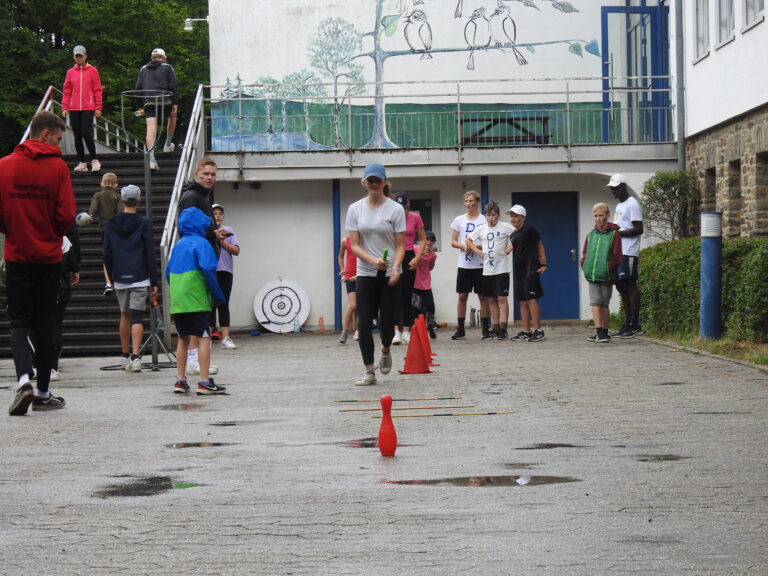 Mit frisch fertiggestellten T-Shirts und Regenjacken bewaffnet machten sich Kinder und Betreuer auf den Weg zum Völkerball- und Fußballfeldes. Unbeeindruckt von den leichten Regenschauern, waren die Kinder voller Vorfreude und auch die Betreuer waren aufgeregt.
